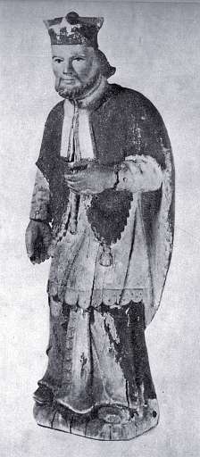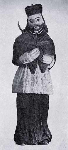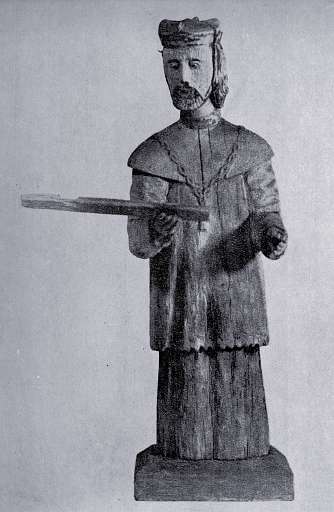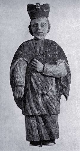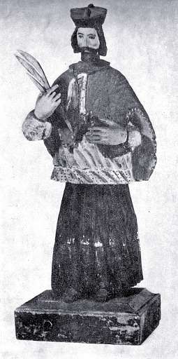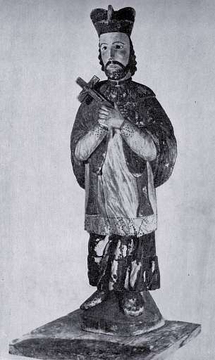 214. ¦w. Jan Nepomucen – il. 119. Drewno lipowe polichromowane, wys. 74, szer. 31, w zbiorach od r. 1933, sposób pozyskania nieznany, Rabka, pow. Nowy Targ. RzeĽba pełna, ujęcie frontalne.