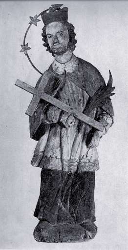 198. ¦w. Jan Nepomucen. Drewno lipowe polichromowane, wys. 41, szer. ok. 16, zakup w r. 1931, Lasek, pow. Nowy Targ. RzeĽba pełna, ujęcie frontalne.