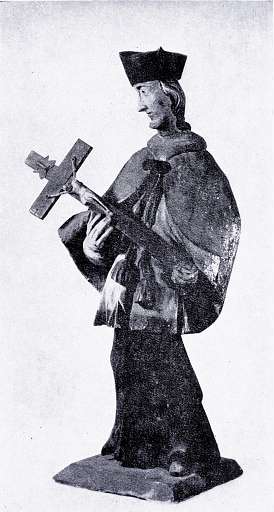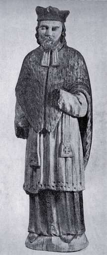 197. ¦w. Jan Nepomucen – il. 112. Drewno lipowe polichromowane, wys. 27, szer. ok. 7, zakup w r. 1932, Rokiciny, pow. Nowy Targ. RzeĽba pełna, ujęcie frontalne.