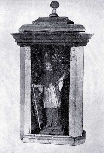 269. Kapliczka przydrożna ze ¶w. Nepomucenem – il. 142. Kapliczka ¶wierkowa z rzeĽb± w drewnie lipowym, polichromowane; kapliczka wys. 50, szer. 26,5, głęb. 11, wys. rzeĽby 25, dar z r. 1929, Rabka-Słone, pow. Nowy Targ. Kapliczka skrzynkowa sze¶cioboczna (...) kryta daszkiem. (...) figura ¶więtego ujęta frontalnie w lekkim kontrapo¶cie.